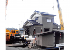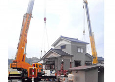 大型クレーン2台で家を壊さずに移動 |